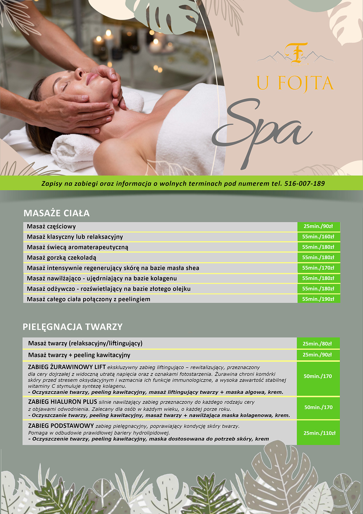 W naszym salonie odnowy biologicznej (SPA) mogą Państwo skorzystać z jacuzzi, sauny suchej i mokrej. Polecamy wypoczynek w naszej Grocie Solnej. Oferujemy naszym Gościom relaks w komfortowych, kameralnych, nowoczesnych i funkcjonalnych wnętrzach. Zapewniamy odpowiednie kosmetyki, szlafroki, ręczniki oraz specjalistyczny personel.